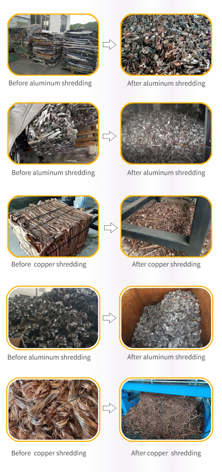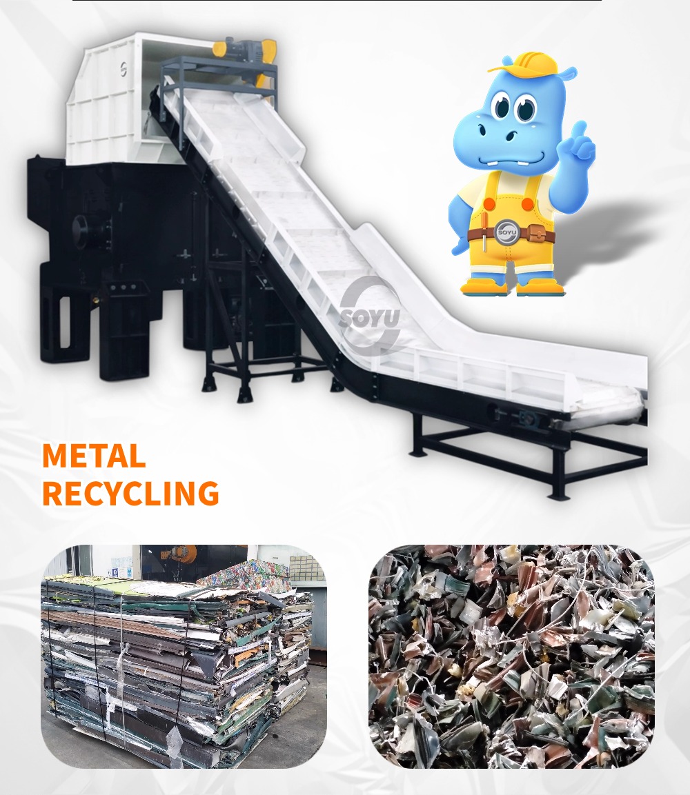 Компания SOYU Machinery самостоятельно разрабатывает и производит линию для измельчения и сортировки отходов металла, предназначенную главным образом для измельчения и сортировки отходов меди, стали, алюминия (упакованного алюминия), корпусов двигателей и т. д., для облегчения их переработки в печах. Благодаря своей экологичности, эффективности, экономичности и возможности индивидуальной настройки, система измельчения и сортировки металла стала незаменимым оборудованием в современной индустрии переработки металлов. Она не только решает проблему обработки металлических отходов, но и вносит значительный вклад в переработку ресурсов и защиту окружающей среды. Благодаря постоянному технологическому прогрессу, система измельчения и сортировки металла будет и впредь использовать свои двойные преимущества в области защиты окружающей среды и эффективности, способствуя устойчивому развитию индустрии переработки металлов.